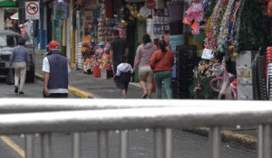 Abarrotada de vendedores ambulantes luce la calle Ambato, donde las veredas y adoquines se han convertido en espacios para la instalación de puestos improvisados. Esta situación complica el desplazamiento de transeúntes y vehículos, mientras los agentes de control de Santo Domingo parecen no intervenir con firmeza ante el creciente desorden.