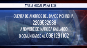 Quienes deseen colaborar pueden hacerlo a través de la cuenta de ahorros del Banco Pichincha 2209532988, a nombre de Narcisa Gallardo, o comunicarse al 0981291102. Hoy, José sigue luchando… y con el apoyo de todos, esa esperanza puede mantenerse viva.